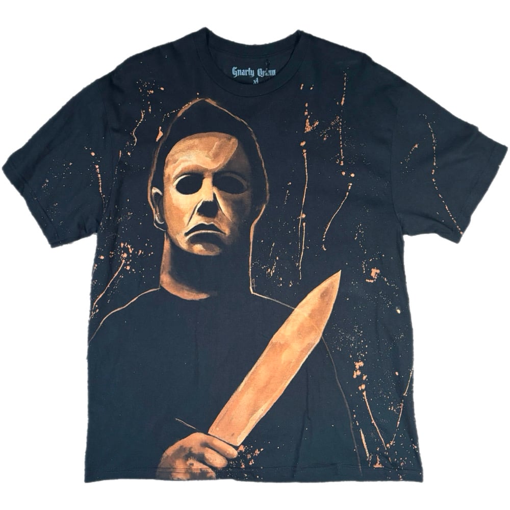 Michael hand painted with bleach in front of t-shirt holding his infamous weapon. Perfect for horror lovers.